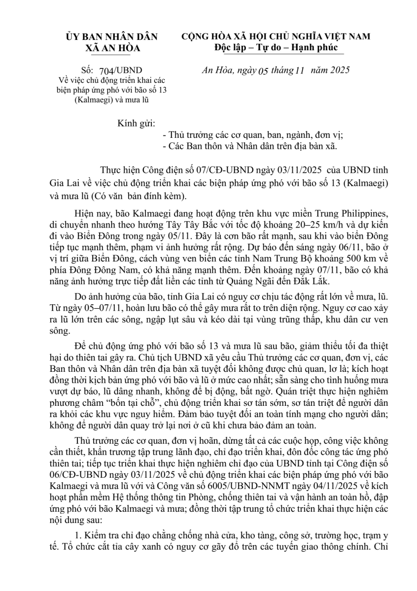 Thứ tư, 05/11/2025 | 20:36 A- A A+ | CHỦ ĐỘNG TRIỂN KHAI CÁC BIỆN PHÁP ỨNG PHÓ VỚI BÃO SỐ 13 (KALMAEGI) VÀ MƯA LŨ Chia sẻ Đọc bài Lưu Về việc chủ động triển khai các biện pháp ứng phó với bão số 13 (Kalmaegi) và mưa lũ UBND xã An Hòa Tác giả: UBND xã An Hòa Từ khóa: UBND xã An Hòa An Hòa Bão số 13 Kalmaegi Tin liên quan NGUỒN VỐN TÍN DỤNG CHÍNH SÁCH GIÚP NGƯỜI DÂN VƯƠN LÊN THOÁT NGHÈO BỀN VỮNG CHỦ ĐỘNG TRIỂN KHAI CÁC BIỆN PHÁP ỨNG PHÓ VỚI BÃO SỐ 13 (KALMAEGI) VÀ MƯA LŨ KÍCH HOẠT PHẦN MỀM HỆ THỐNG THÔNG TIN PHÒNG, CHỐNG THIÊN TAI VÀ VẬN HÀNH AN TOÀN HỒ, ĐẬP ỨNG PHÓ VỚI BÃO KALMAEGI VÀ MƯA LŨ TẬP TRUNG TRIỂN KHAI CÁC NHIỆM VỤ TRỌNG TÂM ĐỂ CHỦ ĐỘNG ỨNG PHÓ VỚI CƠN BÃO SỐ 13 TRIỂN KHAI CÁC BIỆN PHÁP KHẨN CẤP ỨNG PHÓ VỚI BÃO KALMAEGI VÀ MƯA LŨ ĐẠI HỘI ĐẠI BIỂU ĐOÀN TNCS HỒ CHÍ MINH XÃ AN HÒA LẦN THỨ I, NHIỆM KỲ 2025-2030 ĐẢNG ỦY XÃ AN HÒA CÔNG BỐ QUYẾT ĐỊNH VỀ CÔNG TÁC CÁN BỘ TRỒNG ỔI RA TRÁI QUANH NĂM, ĂN GIÒN NGỌT, KHÔNG LO Ế ĐẢNG ỦY AN HÒA: TRAO HUY HIỆU ĐẢNG ĐỢT 7/11 TRIỂN KHAI CÁC BIỆN PHÁP KHẨN ỨNG PHÓ VỚI MUA LỚN, GÂY NGUY CƠ SẠT LỞ ĐẤT VÀ NGẬP LỤT TRÊN ĐỊA BÀN