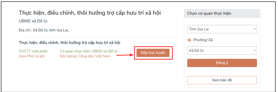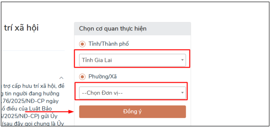 Bước 3: Tại tỉnh/thành phố “Tỉnh Gia Lai” ➔Phường/ xã chọn đươn vị phường nơi cư trú cần nộp ➔Chọn [Đồng ý]