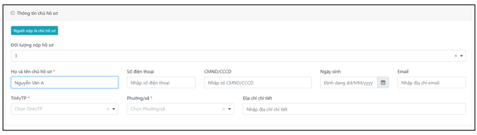 Bước 5: Thực hiện cập nhật thông tin (*) của “Người nộp hồ sơ” và “Chủ hồ sơ” Trường hợp người nộp là chủ hồ sơ bấm nút [Người nộp là chủ hồ sơ]