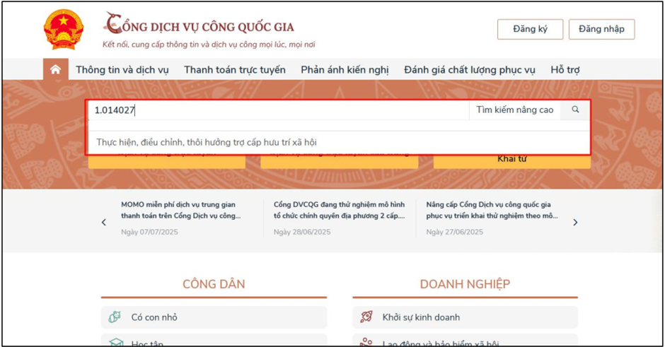 Bước 2: Nhập mã TTHC “1.014027” - Thực hiện, điều chỉnh, thôi hưởng trợ cấp hưu trí xã hội ➔bấm “Tìm kiếm”