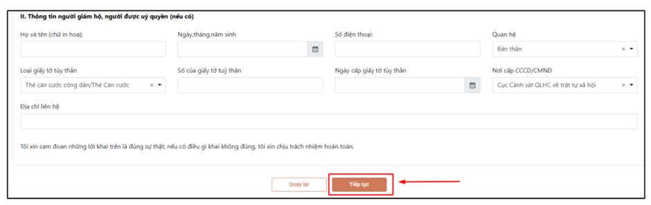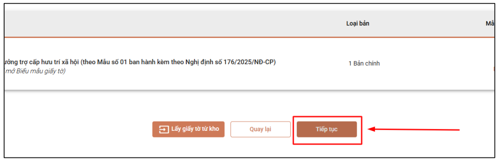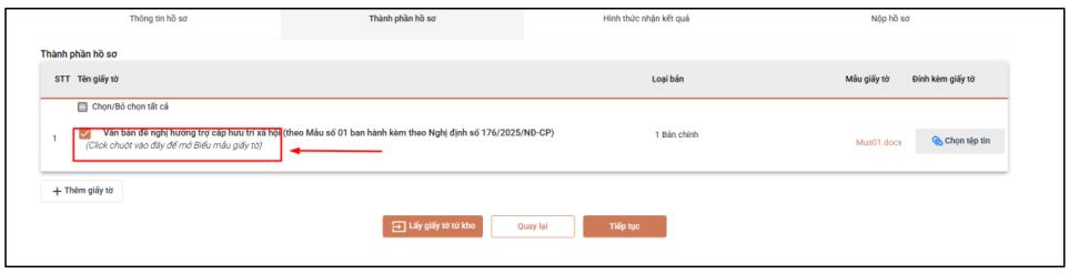 Bước 7: Nhấn [Tiếp tục] để chuyển diện thành phần hồ sơ