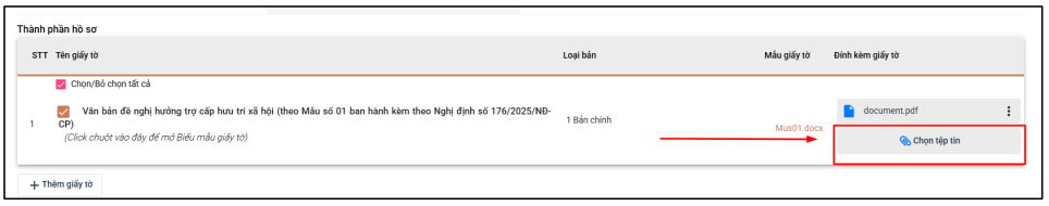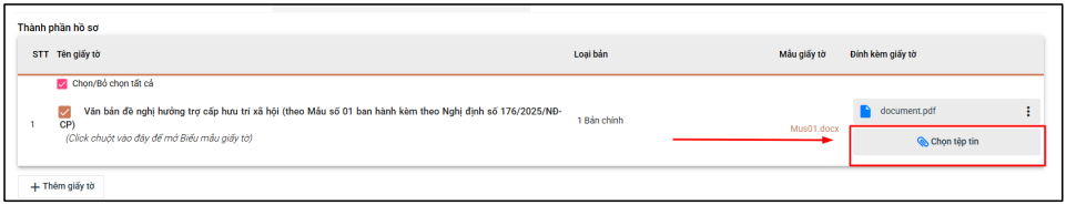 Đính kèm biểu mẫu đã tải xuống lên thành phần hồ sơ của hệ thống tại [Chọn tệp tin]