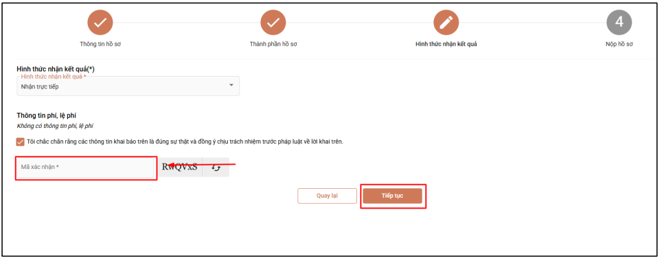 Bước 12: Tích chọn “Tôi chắc chắn rằng ….” ➔ Nhập [Mã xác nhận] ➔ [Tiếp tục]