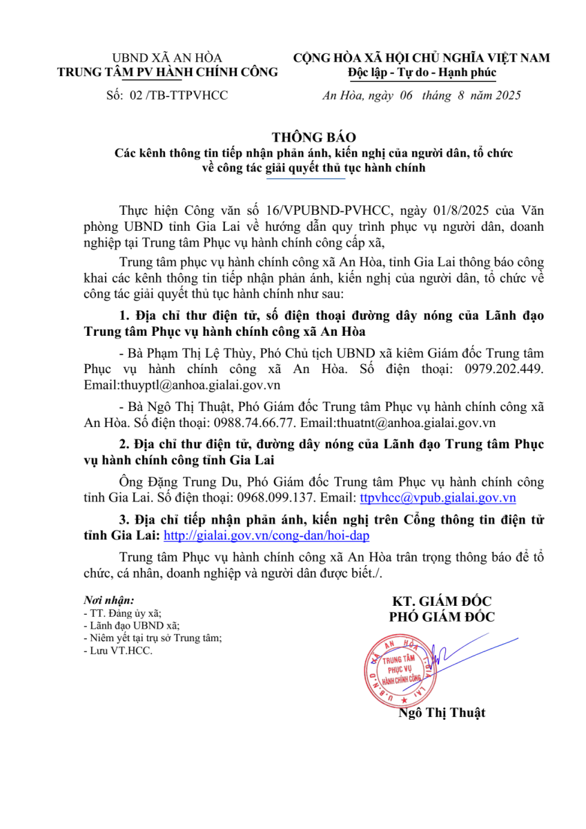 Thông báo: các kênh thông tin tiếp nhận phản ánh, Kiến nghị của người dân, tổ chức về công tác giải quyết thủ tục hành chính