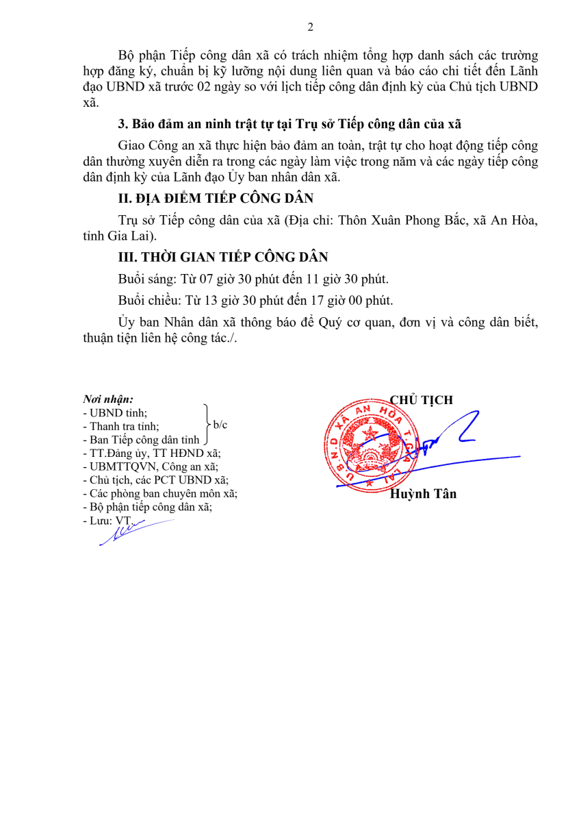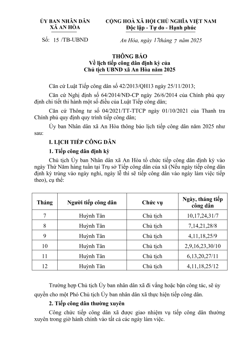 THÔNG BÁO Về lịch tiếp công dân định kỳ của Chủ tịch UBND xã An Hòa năm 2025