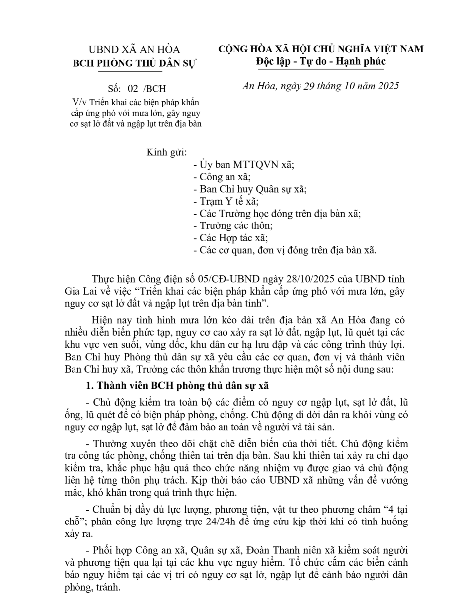 Thứ năm, 30/10/2025 | 08:06 A- A A+ | TRIỂN KHAI CÁC BIỆN PHÁP KHẨN ỨNG PHÓ VỚI MUA LỚN, GÂY NGUY CƠ SẠT LỞ ĐẤT VÀ NGẬP LỤT TRÊN ĐỊA BÀN Chia sẻ Đọc bài Lưu UBND xã An Hòa Tác giả: UBND xã An Hòa Từ khóa: UBND xã An Hòa An Hòa ứng phó thiên tai Tin liên quan ĐẠI HỘI ĐẠI BIỂU ĐOÀN TNCS HỒ CHÍ MINH XÃ AN HÒA LẦN THỨ I, NHIỆM KỲ 2025-2030 ĐẢNG ỦY XÃ AN HÒA CÔNG BỐ QUYẾT ĐỊNH VỀ CÔNG TÁC CÁN BỘ TRỒNG ỔI RA TRÁI QUANH NĂM, ĂN GIÒN NGỌT, KHÔNG LO Ế ĐẢNG ỦY AN HÒA: TRAO HUY HIỆU ĐẢNG ĐỢT 7/11 TRIỂN KHAI CÁC BIỆN PHÁP KHẨN ỨNG PHÓ VỚI MUA LỚN, GÂY NGUY CƠ SẠT LỞ ĐẤT VÀ NGẬP LỤT TRÊN ĐỊA BÀN HỘI LHPN XÃ AN HÒA TỔ CHỨC ĐẠI HỘI ĐẠI BIỂU PHỤ NỮ XÃ LẦN THỨ I, NHIỆM KỲ 2025 - 2030 TIN DỰ BÁO MƯA LỚN TRÊN KHU VỰC TỈNH GIA LAI - ĐÀI KHÍ TƯỢNG THỦY VĂN TỈNH GIA LAI ĐẠI HỘI HỘI NÔNG DÂN XÃ AN HÒA LẦN THỨ I, NHIỆM KỲ 2025 - 2030: KHỞI DẬY KHÁT VỌNG PHÁT TRIỂN NÔNG NGHIỆP, NÔNG DÂN, NÔNG THÔN THỜI KỲ MỚI PHÁT HUY TRUYỀN THỐNG 95 NĂM VẺ VANG CỦA HỘI LIÊN HIỆP PHỤ NỮ VIỆT NAM – PHỤ NỮ XÃ AN HÒA – TIẾP NỐI TRUYỀN THỐNG, VỮNG BƯỚC ĐI LÊN PCT UBND TỈNH DƯƠNG MAH TIỆP KIỂM TRA VÙNG CÓ NGUY CƠ SẠT LỞ CAO THÔN TRÀ CONG