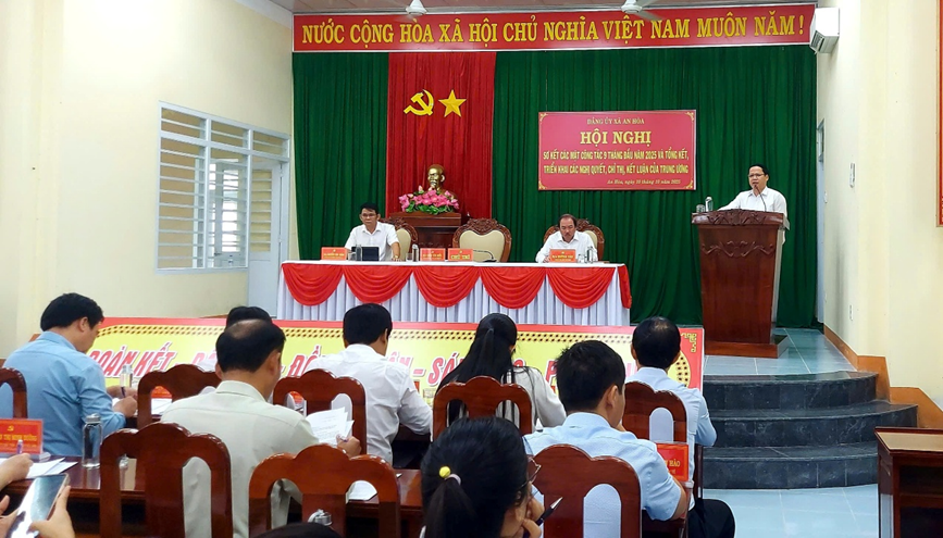 Báo cáo tại hội nghị cho biết: 9 tháng đầu năm, tổng giá trị sản xuất nông - lâm - thủy sản đạt 93,05 tỷ đồng, bằng 77,5% kế hoạch; giá trị sản xuất công nghiệp ước đạt 98,3 tỷ đồng, đạt 73,7% kế hoạch. Tỷ lệ giải ngân vốn đầu tư công đạt 64,5%, tương đương 26,79 tỷ đồng. Trung tâm Phục vụ hành chính công xã đã tiếp nhận 4.365 hồ sơ, giải quyết 4.342 hồ sơ, còn 23 hồ sơ đang xử lý, bảo đảm đúng hạn, không gây phiền hà cho tổ chức, cá nhân.Về công tác xây dựng Đảng, sau khi sáp nhập đơn vị hành chính, Đảng ủy xã tập trung lãnh đạo, chỉ đạo thành lập các tổ chức đảng, kiện toàn bộ máy Đảng, chính quyền, Mặt trận và các đoàn thể theo hướng tinh gọn, hiệu quả. Đồng thời, phân công cấp ủy viên phụ trách địa bàn, lĩnh vực phù hợp năng lực, sở trường; tổ chức thành công Đại hội đại biểu Đảng bộ xã An Hòa lần thứ nhất, nhiệm kỳ 2025-2030…