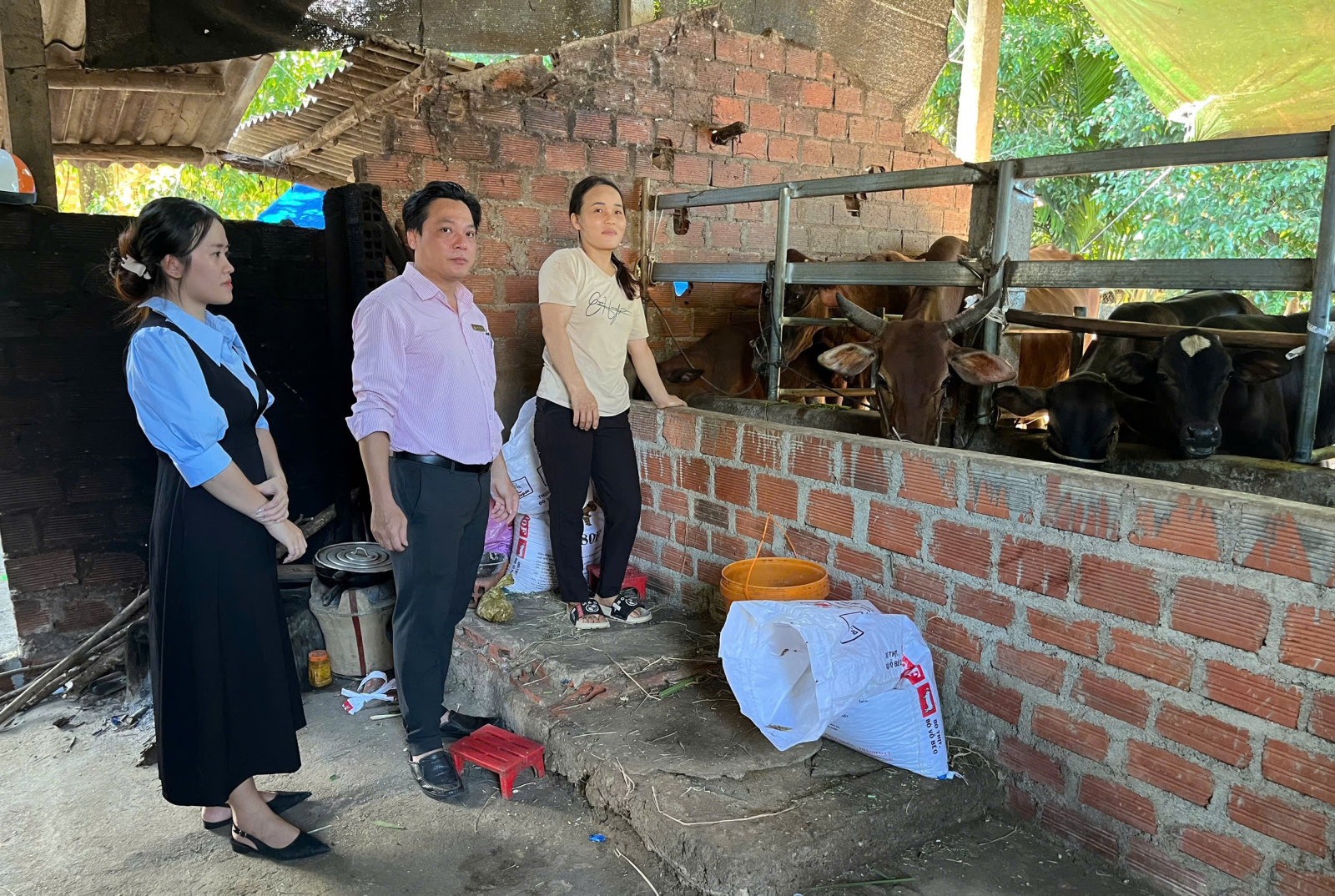 Lãnh đạo Ngân hàng CSXH An Lão và Hội đoàn thể xã kiểm tra mô hình chăn nuôi bò vỗ béo của bà Vương Thị Thạo